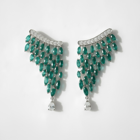 Bold and dramatic, this ear cuff-style piece features a row of diamonds leading to seven flowing strands of richly hued emeralds. It’s an avant-garde yet timeless statement earring that moves with you..